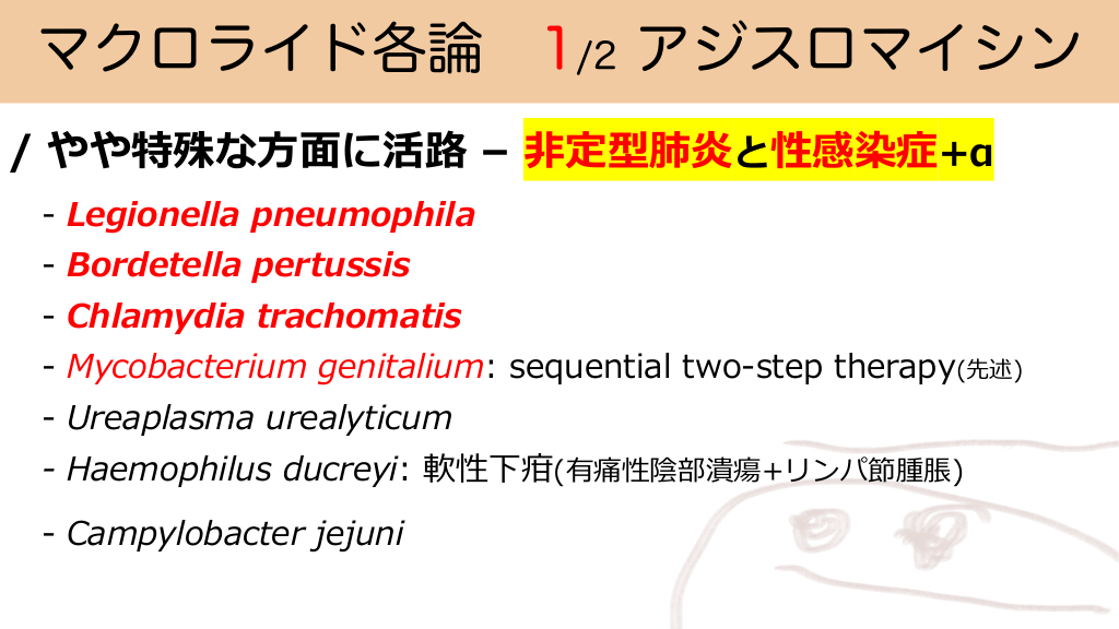 マクロライド各論 1/2 アジスロマイシン / やや特殊な⽅⾯に活路 – ⾮定型肺炎と性感染症+α - Legionella pneumophila - Bordetella pertussis - Chlamydia trachomatis - Mycobacterium genitalium: sequential two-step therapy(先述) - Ureaplasma urealyticum - Haemophilus ducreyi: 軟性下疳(有痛性陰部潰瘍+リンパ節腫脹) - Campylobacter jejuni #33.