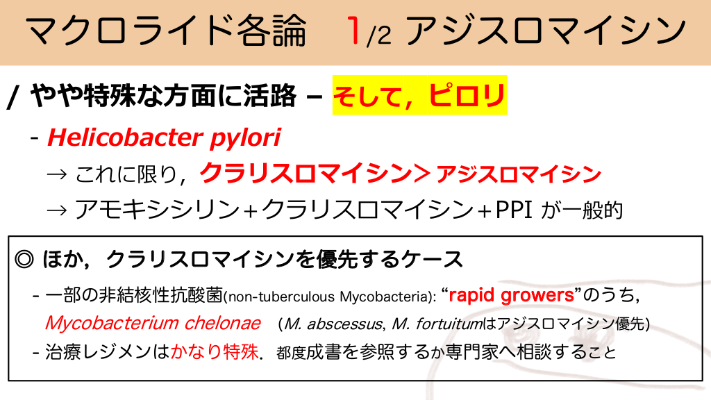 マクロライド各論 1/2 アジスロマイシン / やや特殊な⽅⾯に活路 – そして,ピロリ - Helicobacter pylori → これに限り,クラリスロマイシン>アジスロマイシン → アモキシシリン+クラリスロマイシン+PPI が⼀般的 ◎ ほか,クラリスロマイシンを優先するケース - 一部の非結核性抗酸菌(non-tuberculous Mycobacteria): “rapid growers”のうち, Mycobacterium chelonae (M. abscessus, M. fortuitumはアジスロマイシン優先) - 治療レジメンはかなり特殊.都度成書を参照するか専門家へ相談すること #34.