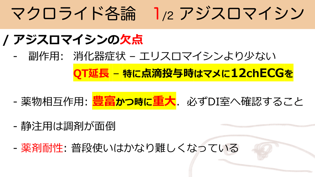 マクロライド各論 1/2 アジスロマイシン / アジスロマイシンの⽋点 - 副作⽤: 消化器症状 – エリスロマイシンより少ない QT延⻑ – 特に点滴投与時はマメに12chECGを - 薬物相互作⽤: 豊富かつ時に重⼤.必ずDI室へ確認すること - 静注⽤は調剤が⾯倒 - 薬剤耐性: 普段使いはかなり難しくなっている フィダキソマイシンの使用と総評 #35.
