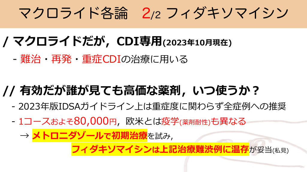マクロライド各論 2/2 フィダキソマイシン / マクロライドだが,CDI専⽤(2023年10⽉現在) - 難治・再発・重症CDIの治療に⽤いる // 有効だが誰が⾒ても⾼価な薬剤,いつ使うか︖ - 2023年版IDSAガイドライン上は重症度に関わらず全症例への推奨 - 1コースおよそ80,000円,欧⽶とは疫学(薬剤耐性)も異なる → メトロニダゾールで初期治療を試み, フィダキソマイシンは上記治療難渋例に温存が妥当(私⾒) #36.