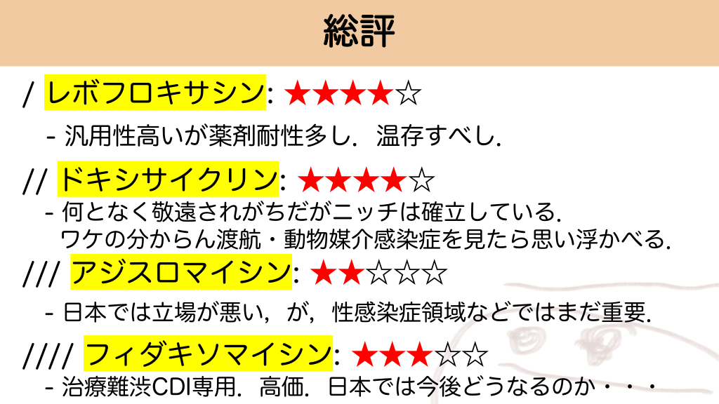 総評 / レボフロキサシン: ★★★★☆ - 汎用性高いが薬剤耐性多し.温存すべし. // ドキシサイクリン: ★★★★☆ - 何となく敬遠されがちだがニッチは確立している. ワケの分からん渡航・動物媒介感染症を見たら思い浮かべる. /// アジスロマイシン: ★★☆☆☆ - 日本では立場が悪い,が,性感染症領域などではまだ重要. //// フィダキソマイシン: ★★★☆☆ - 治療難渋CDI専用.高価.日本では今後どうなるのか・・・ #37.