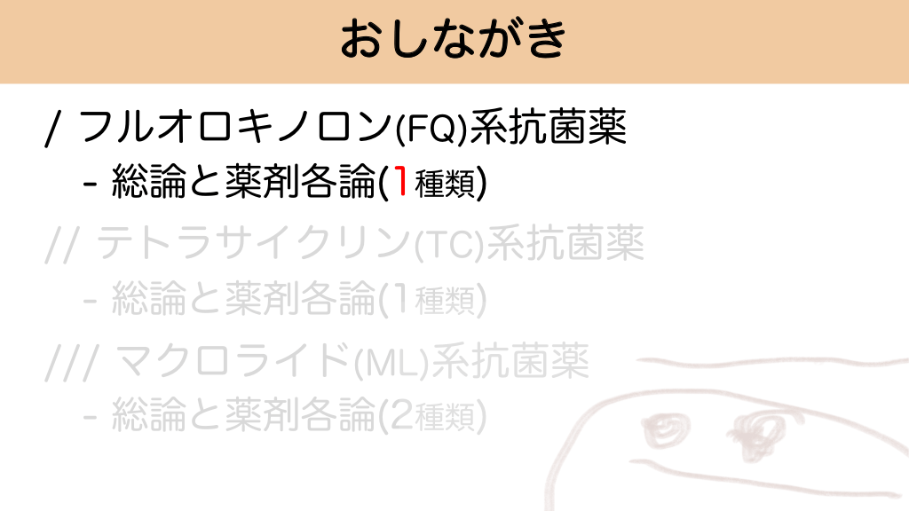 おしながき / フルオロキノロン(FQ)系抗菌薬 - 総論と薬剤各論(1種類) // テトラサイクリン(TC)系抗菌薬 - 総論と薬剤各論(1種類) /// マクロライド(ML)系抗菌薬 - 総論と薬剤各論(2種類) #5.