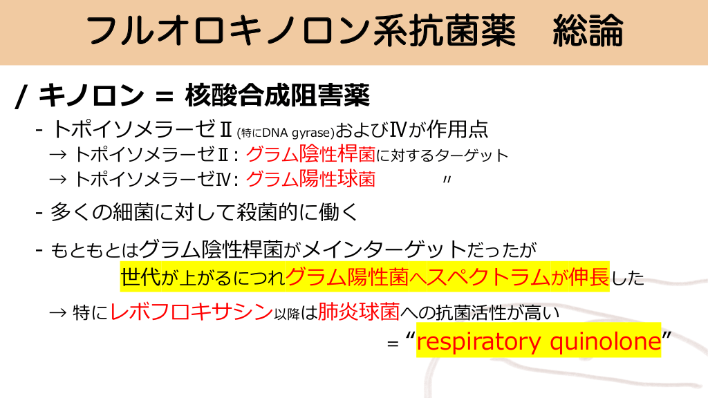 フルオロキノロン系抗菌薬 総論 / キノロン = 核酸合成阻害薬 - トポイソメラーゼⅡ(特にDNA gyrase)およびⅣが作⽤点 → トポイソメラーゼⅡ: グラム陰性桿菌に対するターゲット → トポイソメラーゼⅣ: グラム陽性球菌 〃 - 多くの細菌に対して殺菌的に働く - もともとはグラム陰性桿菌がメインターゲットだったが 世代が上がるにつれグラム陽性菌へスペクトラムが伸⻑した → 特にレボフロキサシン以降は肺炎球菌への抗菌活性が⾼い = “respiratory quinolone” #6.