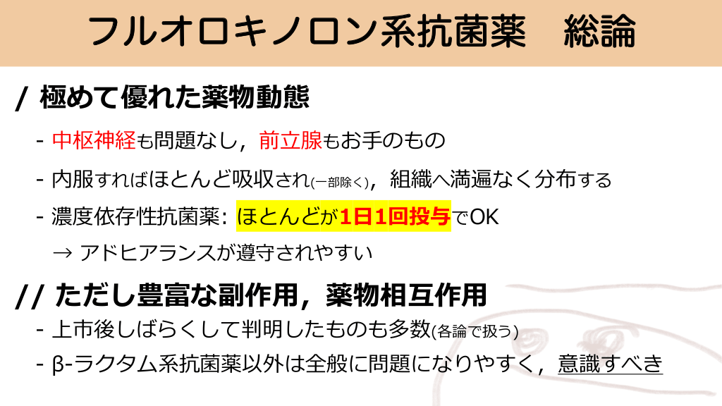 フルオロキノロン系抗菌薬 総論 / 極めて優れた薬物動態 - 中枢神経も問題なし,前⽴腺もお⼿のもの - 内服すればほとんど吸収され(⼀部除く),組織へ満遍なく分布する - 濃度依存性抗菌薬: ほとんどが1⽇1回投与でOK → アドヒアランスが遵守されやすい // ただし豊富な副作⽤,薬物相互作⽤ - 上市後しばらくして判明したものも多数(各論で扱う) - β-ラクタム系抗菌薬以外は全般に問題になりやすく,意識すべき #8.