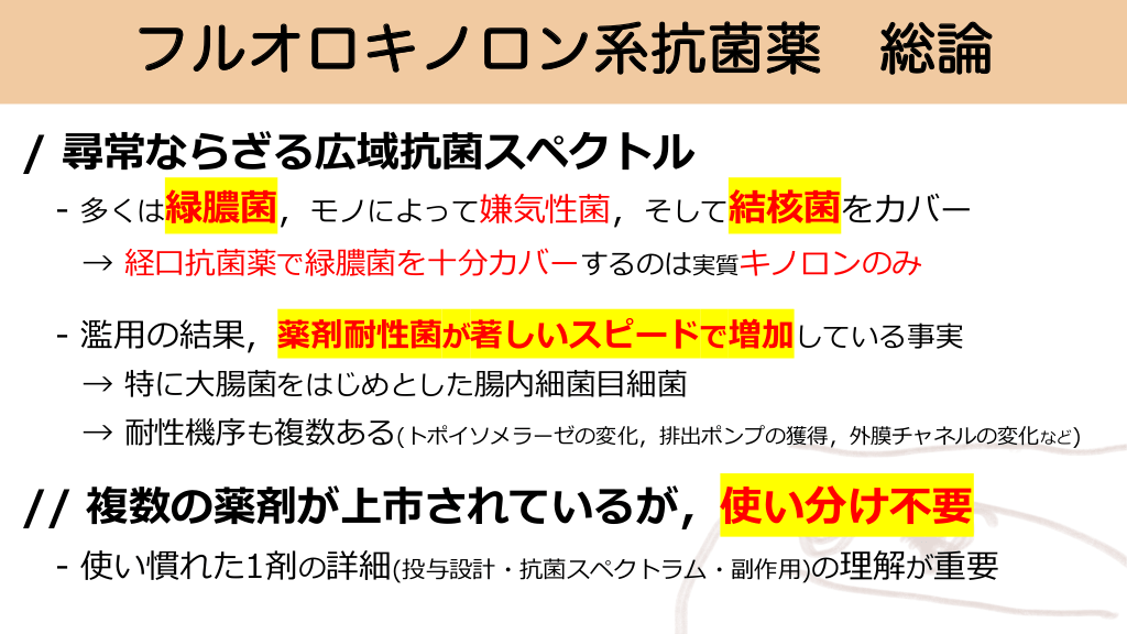 executive summery / これらのクラスの薬剤の用途は少々特殊である // 副作用や薬物相互作用に注意を要する /// フルオロキノロンの抗結核作用に注意 //// マクロライドの普段使いはもはや無理 #3.