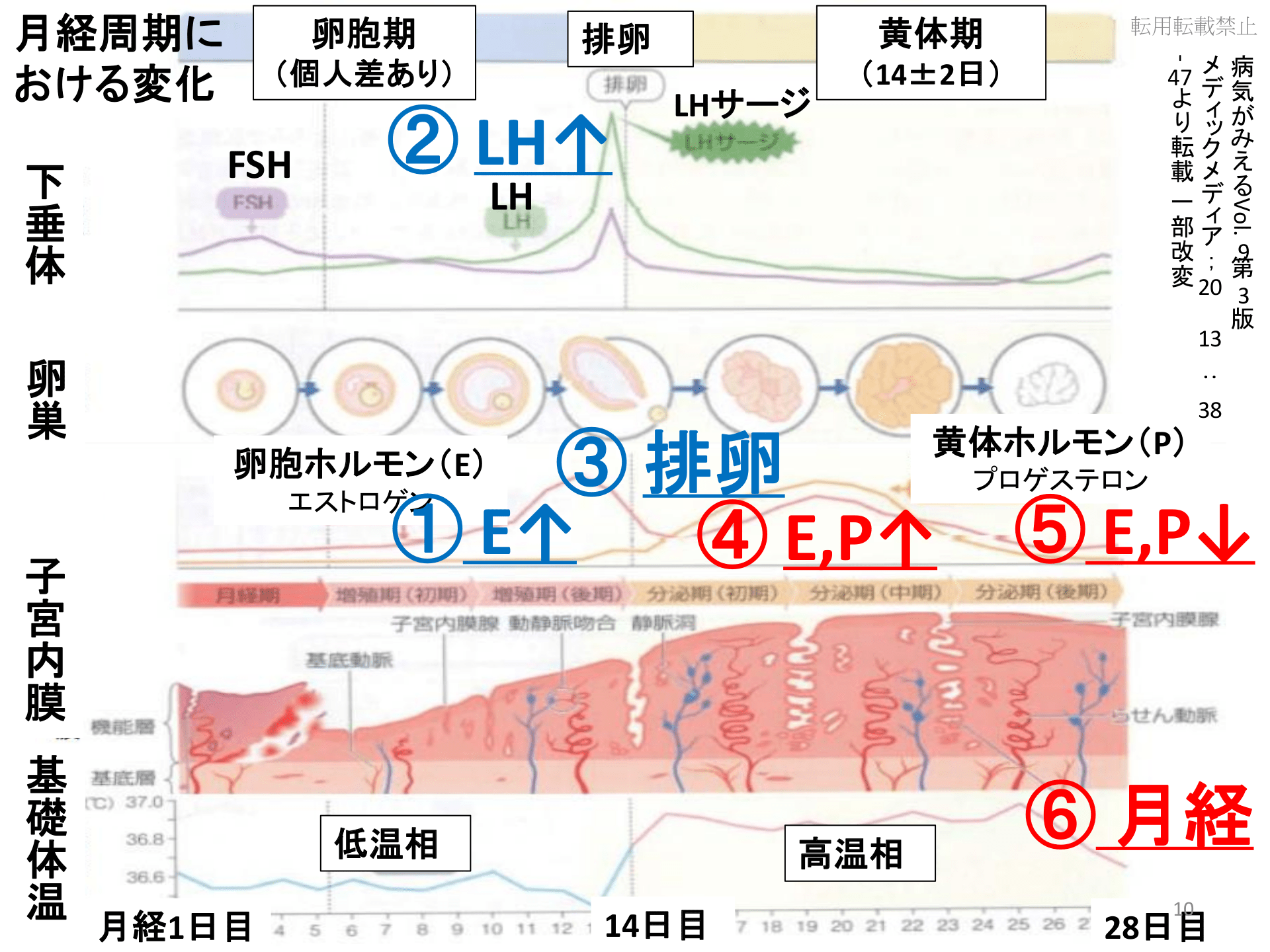 #10. 黄体期 排卵 ② LH↑ LHサージ LH : 卵 巣 38 黄体ホルモン(P) ③ 排卵 ① E↑ ④ E,P↑ 卵胞ホルモン(E) エストロゲン 子 宮 内 膜 基 礎 体 温 病 47 メ デ よ 気 が りィ ッみ 転ク 載メえ る 一デ 部ィ ア 改; 9 変 20 第 3 版 13 (14±2日) (個人差あり) FSH 転用転載禁止 Vol. 下 垂 体 卵胞期 - 月経周期に おける変化 低温相 月経1日目 高温相 14日目 プロゲステロン ⑤ E,P↓ ⑥ 月経 10 28日目