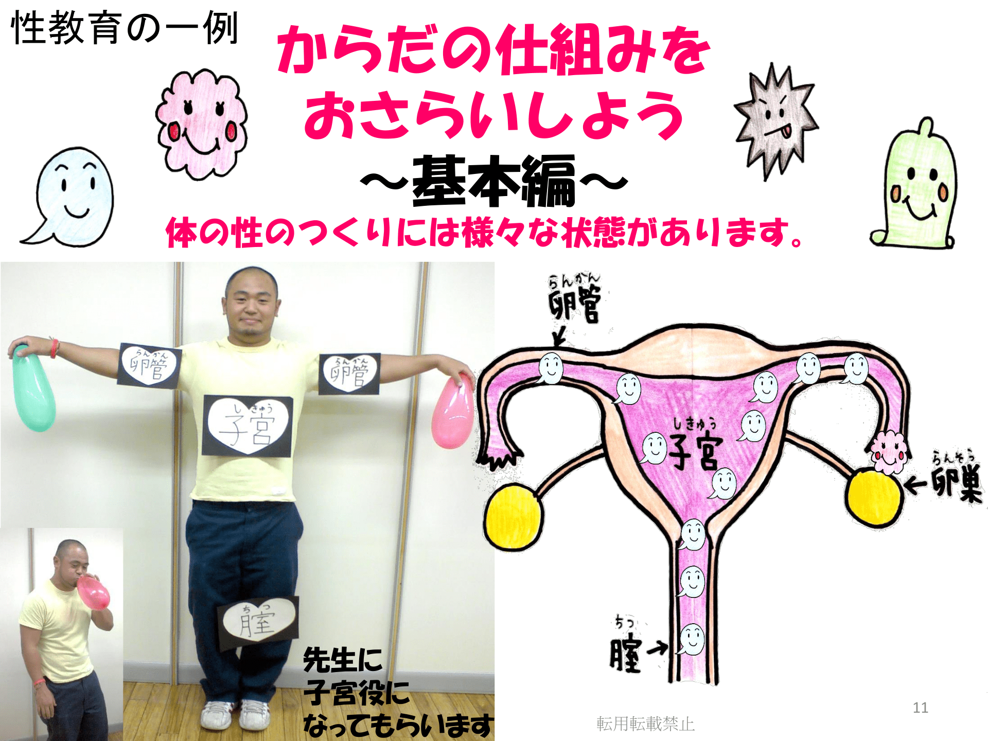 #11. 性教育の一例 からだの仕組みを おさらいしよう ~基本編~ 体の性のつくりには様々な状態があります。 先生に 子宮役に なってもらいます 転用転載禁止 11