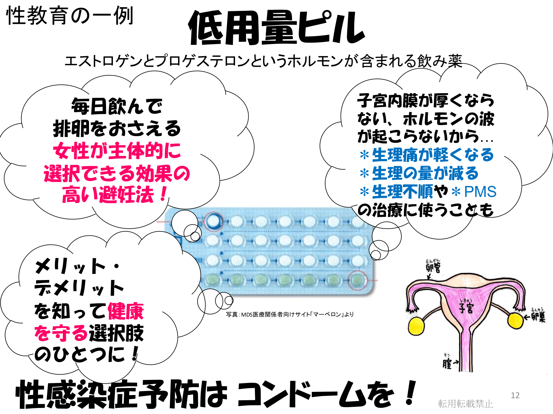 #12. 性教育の一例 低用量ピル エストロゲンとプロゲステロンというホルモンが含まれる飲み薬 子宮内膜が厚くなら ない、ホルモンの波 が起こらないから… *生理痛が軽くなる *生理の量が減る *生理不順や*PMS の治療に使うことも 毎日飲んで 排卵をおさえる 女性が主体的に 選択できる効果の 高い避妊法! メリット・ デメリット を知って健康 を守る選択肢 のひとつに! 写真:MDS医療関係者向けサイト「マーベロン」より 性感染症予防は コンドームを! 転用転載禁止 12