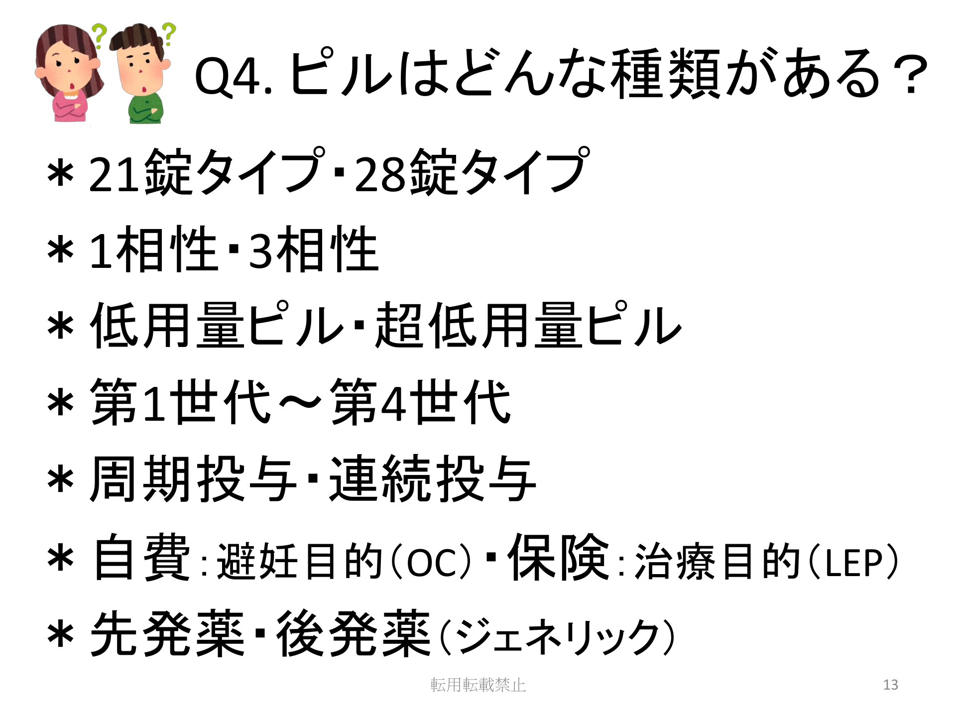 #13. Q4. ピルはどんな種類がある? *21錠タイプ・28錠タイプ *1相性・3相性 *低用量ピル・超低用量ピル *第1世代~第4世代 *周期投与・連続投与 *自費:避妊目的(OC)・保険:治療目的(LEP) *先発薬・後発薬(ジェネリック) 転用転載禁止 13
