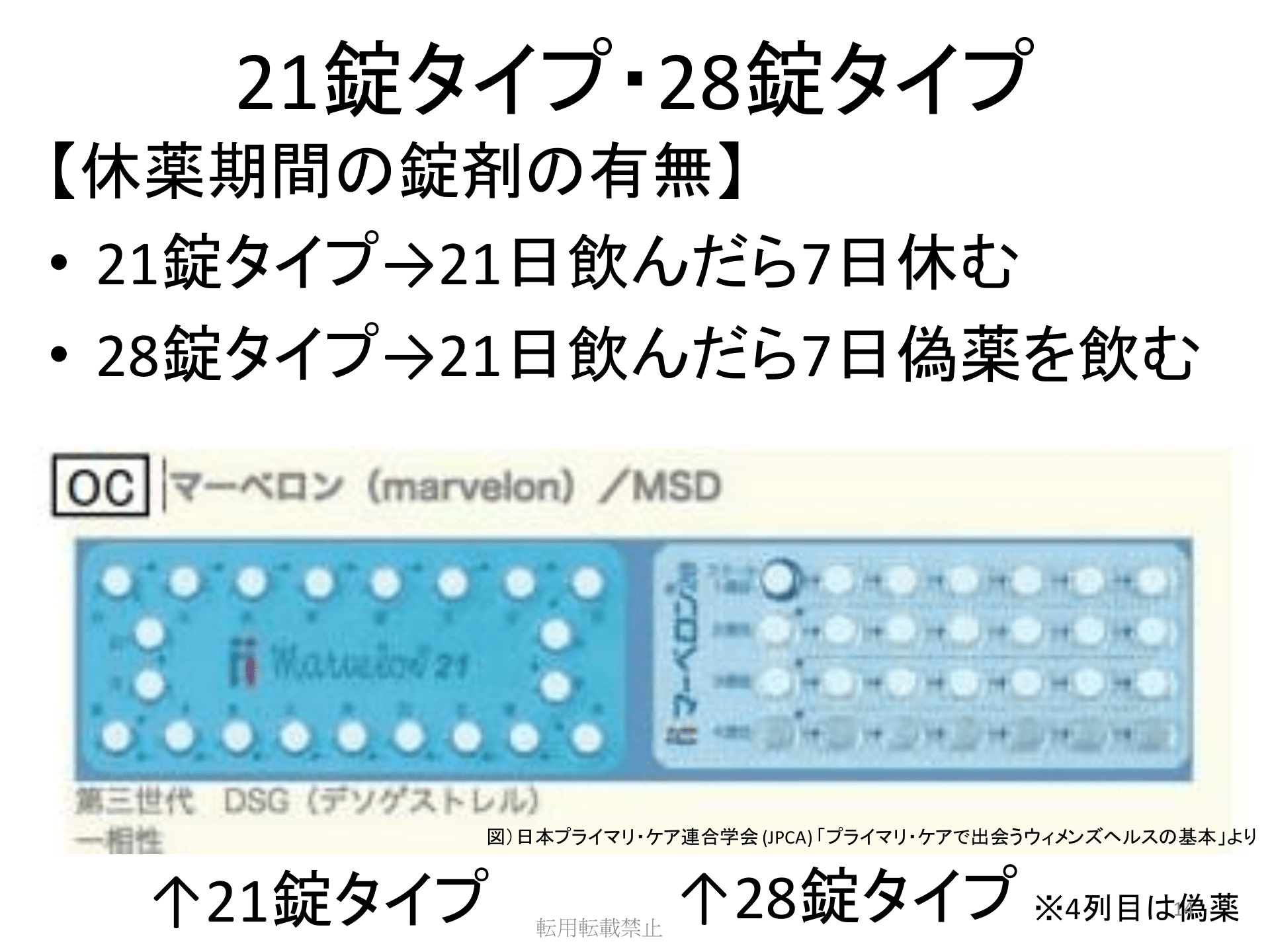 #14. 21錠タイプ・28錠タイプ 【休薬期間の錠剤の有無】 • 21錠タイプ→21日飲んだら7日休む • 28錠タイプ→21日飲んだら7日偽薬を飲む 図)日本プライマリ・ケア連合学会 (JPCA) 「プライマリ・ケアで出会うウィメンズヘルスの基本」より ↑21錠タイプ 転用転載禁止 ↑28錠タイプ ※4列目は偽薬 14