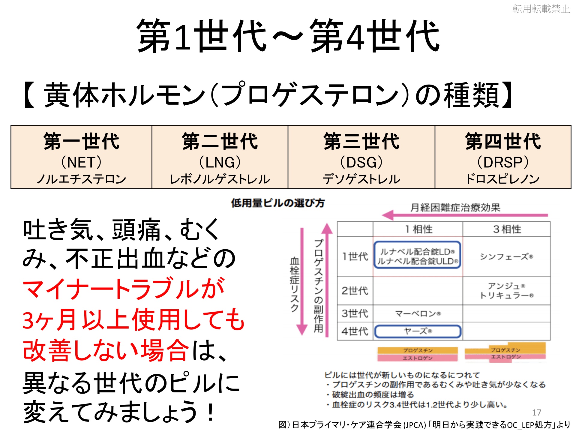 #17. 転用転載禁止 第1世代~第4世代 【 黄体ホルモン(プロゲステロン)の種類】 第一世代 第二世代 第三世代 第四世代 (NET) (LNG) (DSG) (DRSP) ノルエチステロン レボノルゲストレル デソゲストレル ドロスピレノン 吐き気、頭痛、むく み、不正出血などの マイナートラブルが 3ヶ月以上使用しても 改善しない場合は、 異なる世代のピルに 変えてみましょう! 17 図)日本プライマリ・ケア連合学会 (JPCA) 「明日から実践できるOC_LEP処方」より