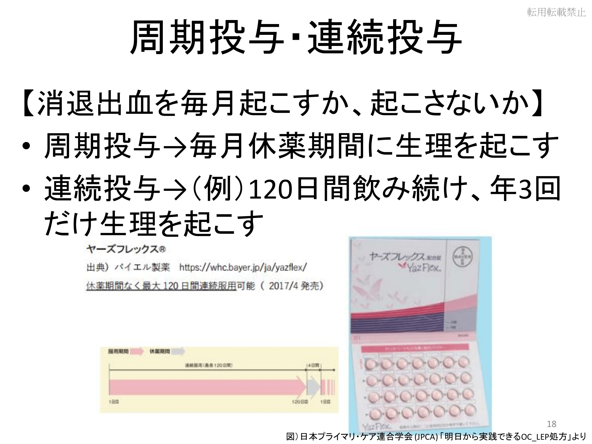 #18. 周期投与・連続投与 転用転載禁止 【消退出血を毎月起こすか、起こさないか】 • 周期投与→毎月休薬期間に生理を起こす • 連続投与→(例)120日間飲み続け、年3回 だけ生理を起こす 18 図)日本プライマリ・ケア連合学会 (JPCA) 「明日から実践できるOC_LEP処方」より