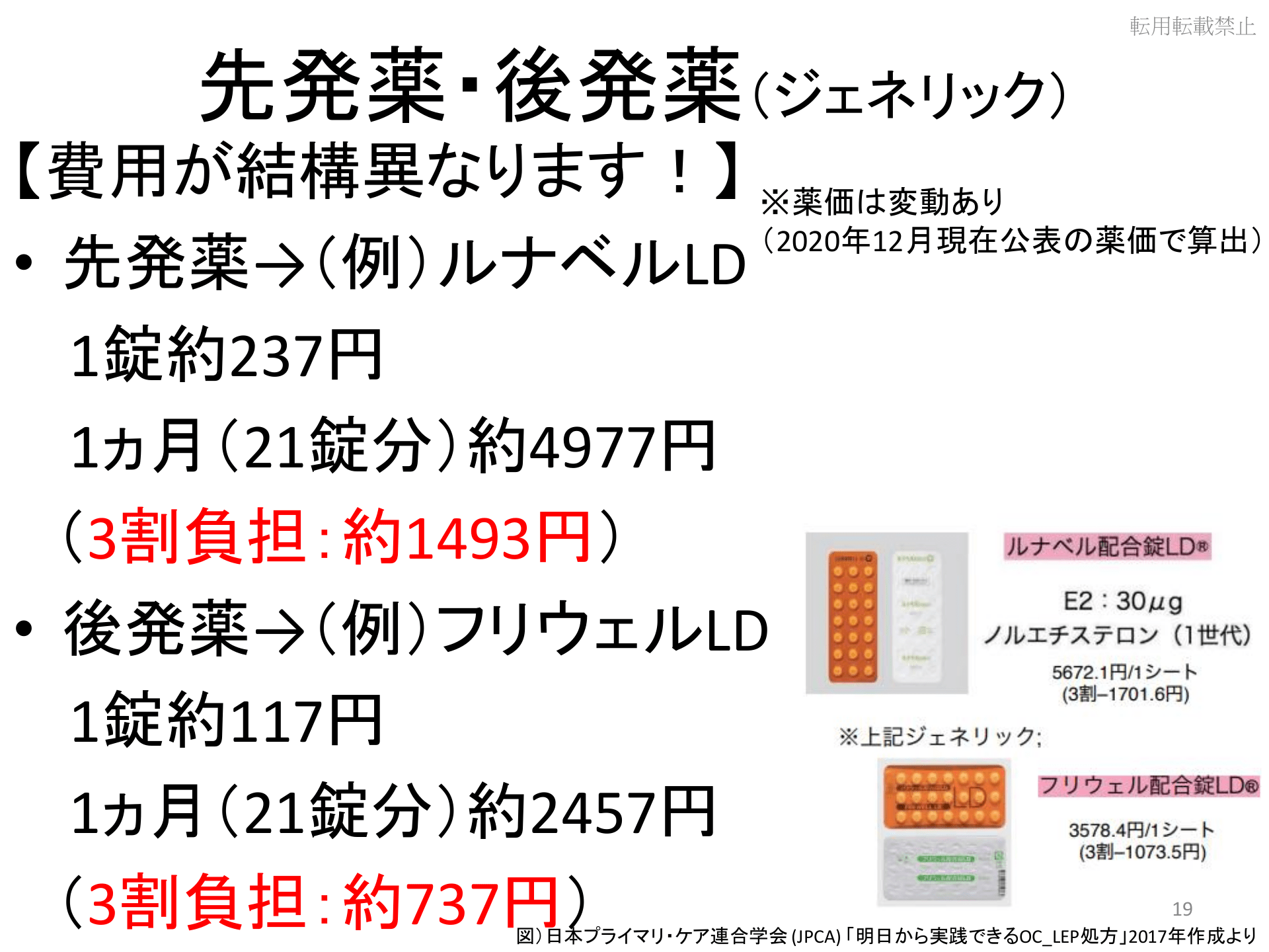 #19. 転用転載禁止 先発薬・後発薬(ジェネリック) 【費用が結構異なります!】 ※薬価は変動あり (2020年12月現在公表の薬価で算出) • 先発薬→(例)ルナベルLD 1錠約237円 1ヵ月(21錠分)約4977円 (3割負担:約1493円) • 後発薬→(例)フリウェルLD 1錠約117円 1ヵ月(21錠分)約2457円 (3割負担:約737円) 19 図)日本プライマリ・ケア連合学会 (JPCA) 「明日から実践できるOC_LEP処方」2017年作成より