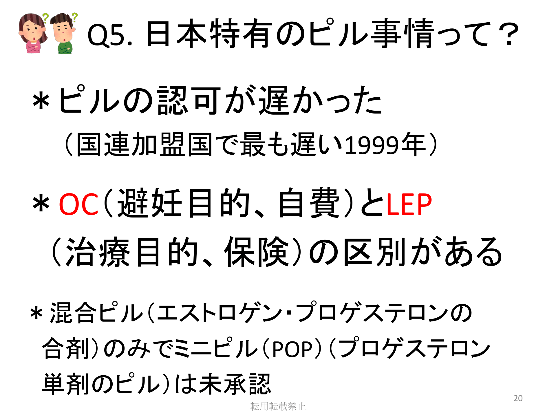 #20. Q5. 日本特有のピル事情って? *ピルの認可が遅かった (国連加盟国で最も遅い1999年) *OC(避妊目的、自費)とLEP (治療目的、保険)の区別がある *混合ピル(エストロゲン・プロゲステロンの 合剤)のみでミニピル(POP)(プロゲステロン 単剤のピル)は未承認 転用転載禁止 20