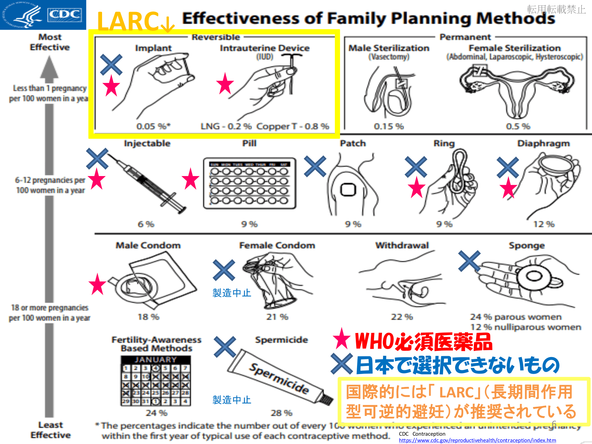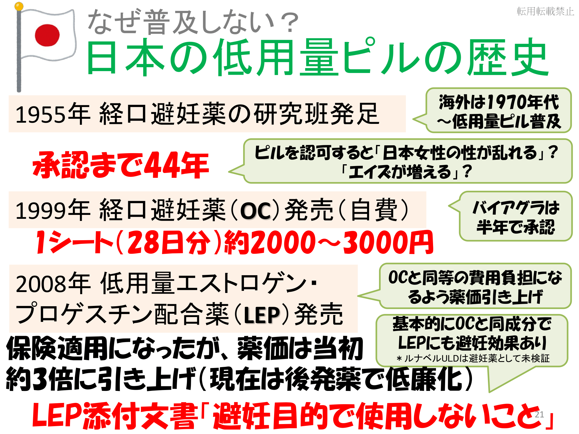 #21. 転用転載禁止 なぜ普及しない? 日本の低用量ピルの歴史 海外は1970年代 ~低用量ピル普及 1955年 経口避妊薬の研究班発足 承認まで44年 ピルを認可すると「日本女性の性が乱れる」? 「エイズが増える」? 1999年 経口避妊薬(OC)発売(自費) 1シート(28日分)約2000~3000円 バイアグラは 半年で承認 OCと同等の費用負担にな 2008年 低用量エストロゲン・ るよう薬価引き上げ プロゲスチン配合薬(LEP)発売 基本的にOCと同成分で 保険適用になったが、薬価は当初 LEPにも避妊効果あり 約3倍に引き上げ(現在は後発薬で低廉化) *ルナベルULDは避妊薬として未検証 LEP添付文書「避妊目的で使用しないこと」 21