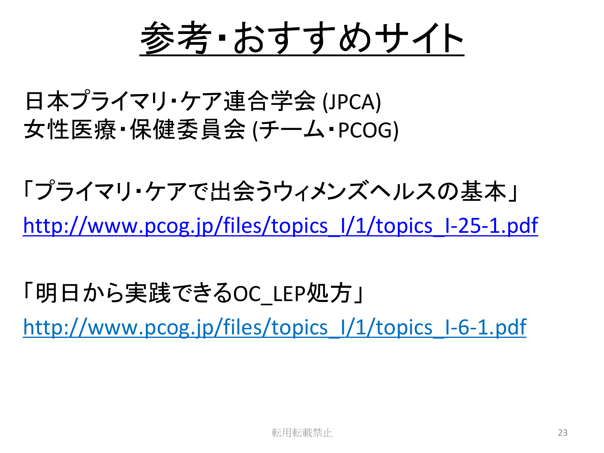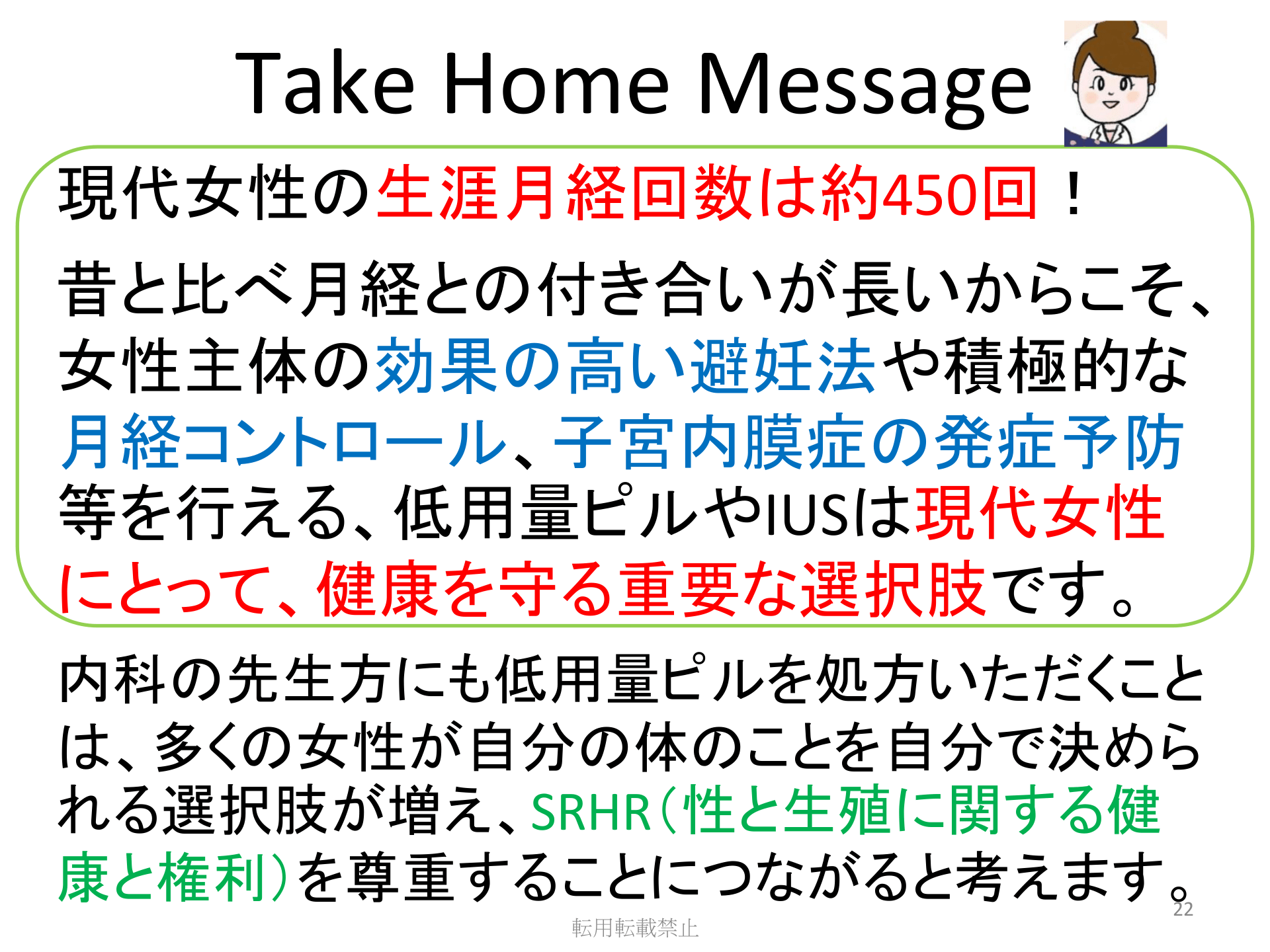 #22. Take Home Message 現代女性の生涯月経回数は約450回! 昔と比べ月経との付き合いが長いからこそ、 女性主体の効果の高い避妊法や積極的な 月経コントロール、子宮内膜症の発症予防 等を行える、低用量ピルやIUSは現代女性 にとって、健康を守る重要な選択肢です。 内科の先生方にも低用量ピルを処方いただくこと は、多くの女性が自分の体のことを自分で決めら れる選択肢が増え、SRHR(性と生殖に関する健 康と権利)を尊重することにつながると考えます。 転用転載禁止 22