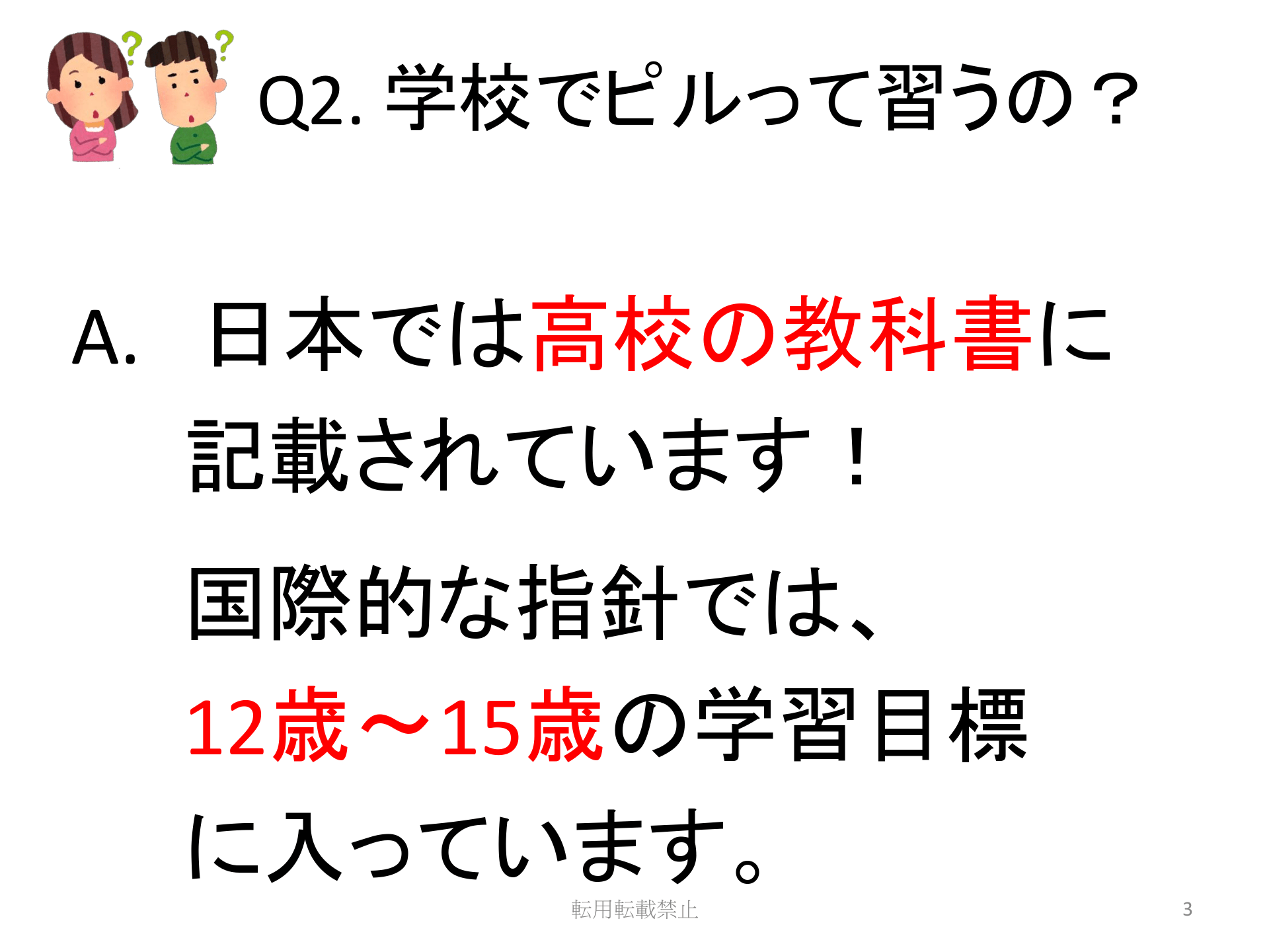 #3. Q2. 学校でピルって習うの? A. 日本では高校の教科書に 記載されています! 国際的な指針では、 12歳~15歳の学習目標 に入っています。 転用転載禁止 3