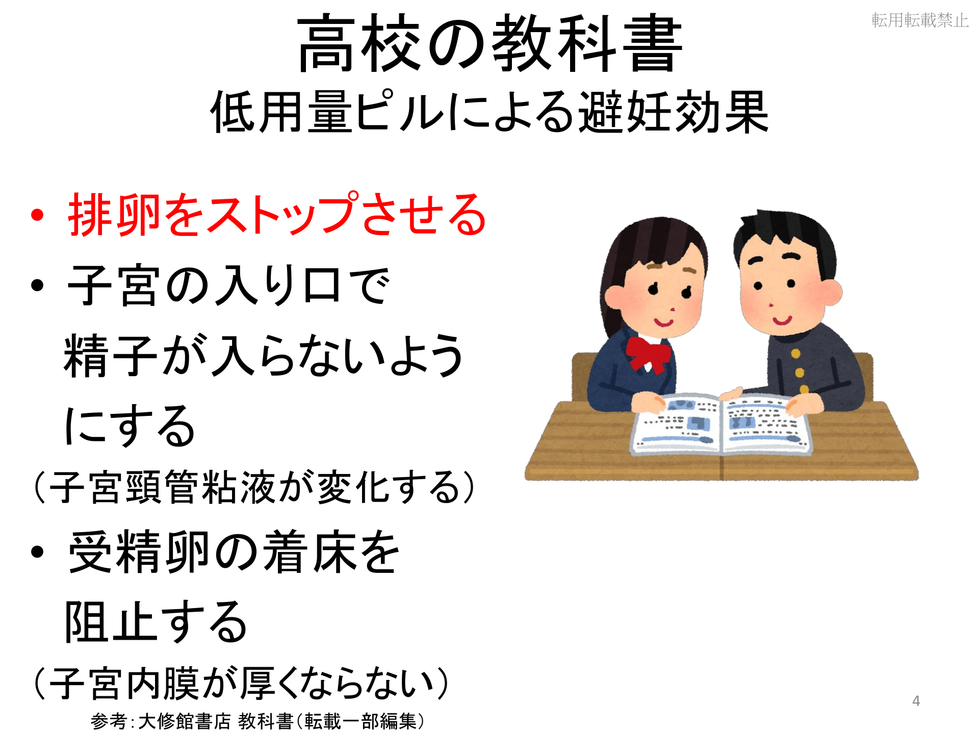 #4. 高校の教科書 転用転載禁止 低用量ピルによる避妊効果 • 排卵をストップさせる • 子宮の入り口で 精子が入らないよう にする (子宮頸管粘液が変化する) • 受精卵の着床を 阻止する (子宮内膜が厚くならない) 参考:大修館書店 教科書(転載一部編集) 4