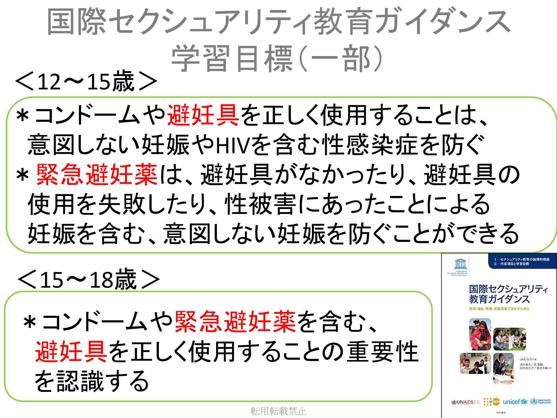 #5. 国際セクシュアリティ教育ガイダンス 学習目標(一部) <12~15歳> *コンドームや避妊具を正しく使用することは、 意図しない妊娠やHIVを含む性感染症を防ぐ *緊急避妊薬は、避妊具がなかったり、避妊具の 使用を失敗したり、性被害にあったことによる 妊娠を含む、意図しない妊娠を防ぐことができる <15~18歳> *コンドームや緊急避妊薬を含む、 避妊具を正しく使用することの重要性 を認識する 5 転用転載禁止