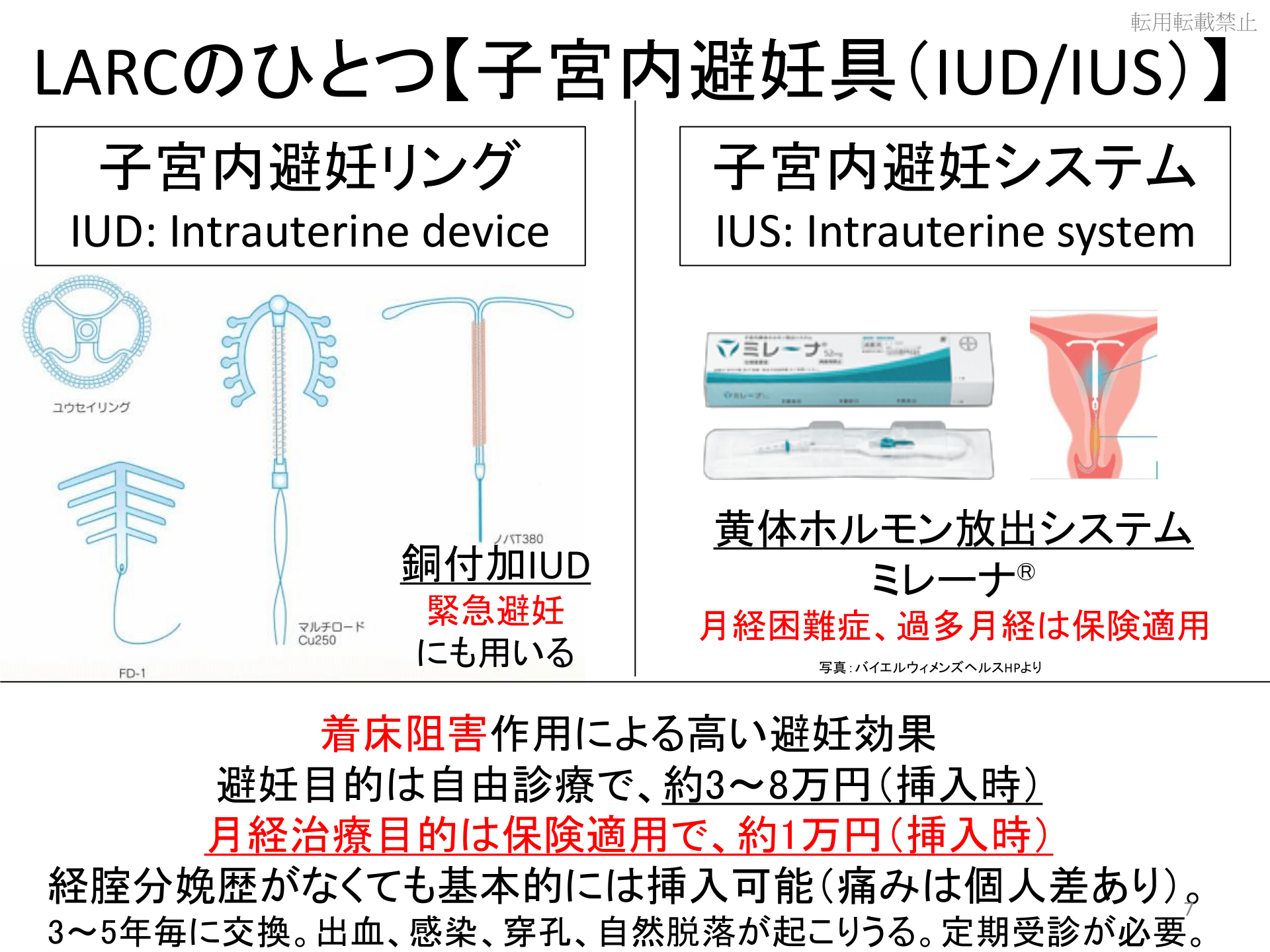 #7. 転用転載禁止 LARCのひとつ【子宮内避妊具(IUD/IUS)】 子宮内避妊リング 子宮内避妊システム IUD: Intrauterine device IUS: Intrauterine system 銅付加IUD 緊急避妊 にも用いる 黄体ホルモン放出システム ミレーナ® 月経困難症、過多月経は保険適用 写真:バイエルウィメンズヘルスHPより 着床阻害作用による高い避妊効果 避妊目的は自由診療で、約3~8万円(挿入時) 月経治療目的は保険適用で、約1万円(挿入時) 経腟分娩歴がなくても基本的には挿入可能(痛みは個人差あり)。 7 3~5年毎に交換。出血、感染、穿孔、自然脱落が起こりうる。定期受診が必要。