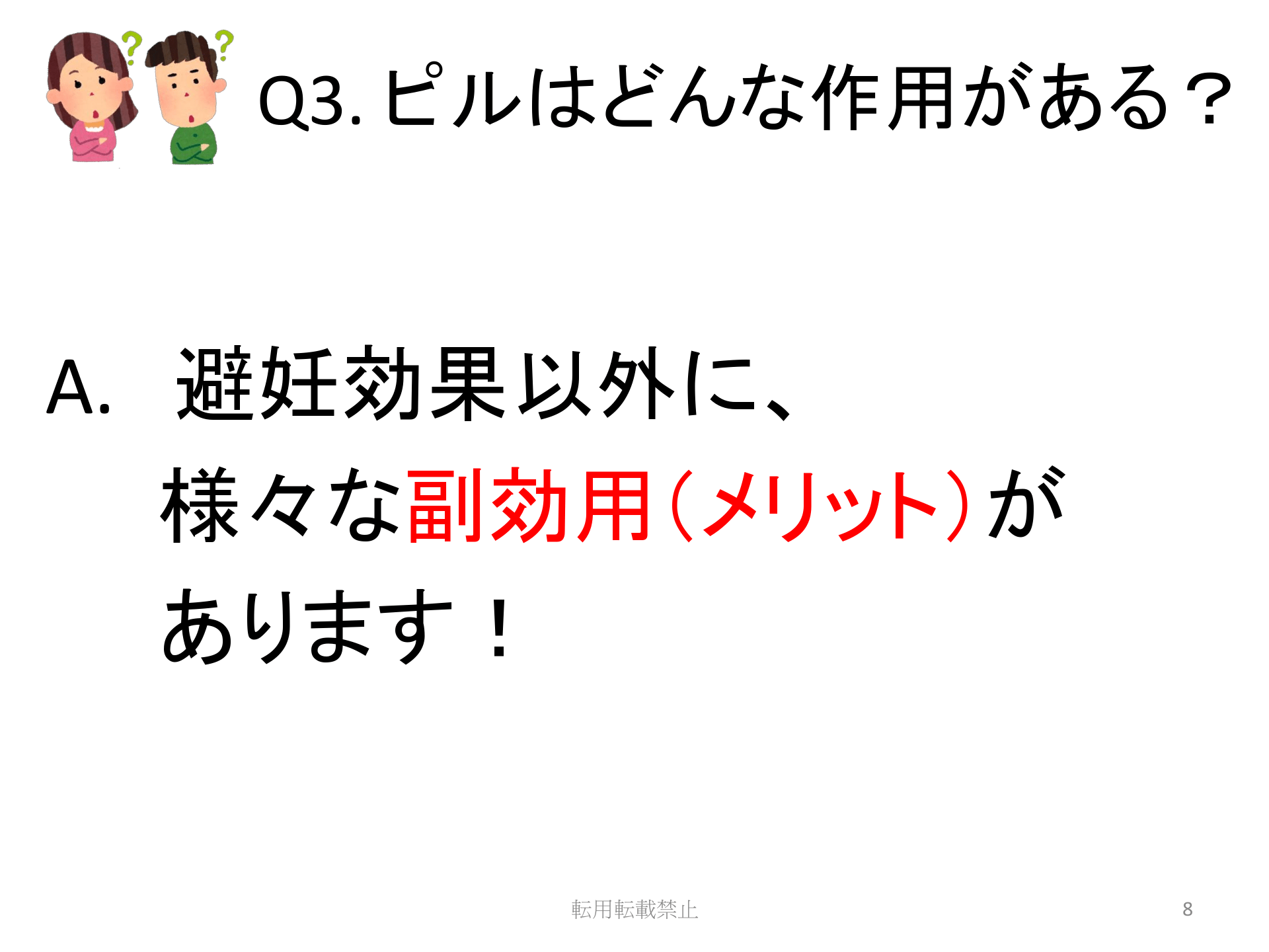 #8. Q3. ピルはどんな作用がある? A. 避妊効果以外に、 様々な副効用(メリット)が あります! 転用転載禁止 8