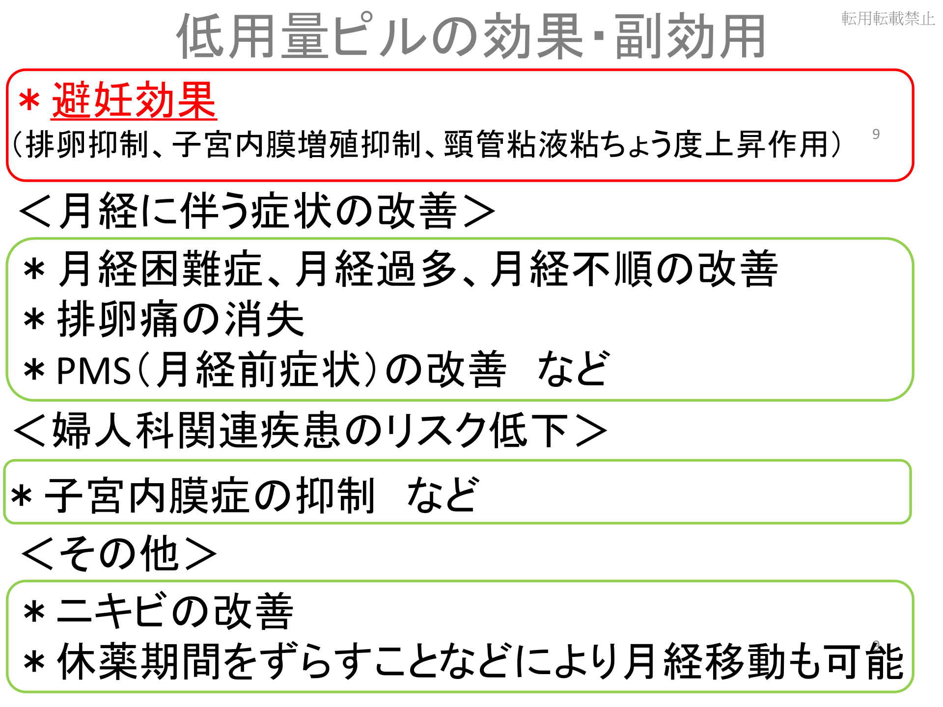 #9. 低用量ピルの効果・副効用 転用転載禁止 *避妊効果 (排卵抑制、子宮内膜増殖抑制、頸管粘液粘ちょう度上昇作用) 9 <月経に伴う症状の改善> *月経困難症、月経過多、月経不順の改善 *排卵痛の消失 *PMS(月経前症状)の改善 など <婦人科関連疾患のリスク低下> *子宮内膜症の抑制 など <その他> *ニキビの改善 *休薬期間をずらすことなどにより月経移動も可能 9