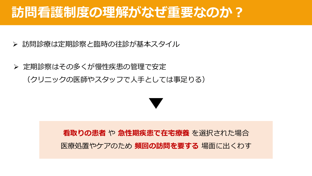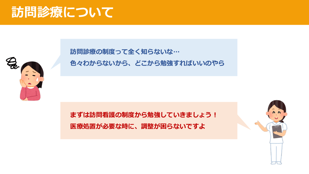 #3. 訪問診療について 訪問診療の制度って全く知らないな… ⾊々わからないから、どこから勉強すればいいのやら まずは訪問看護の制度から勉強していきましょう︕ 医療処置が必要な時に、調整が困らないですよ