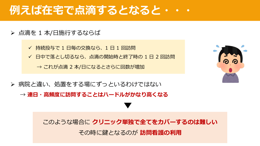 #11. 例えば在宅で点滴するとなると・・・ Ø 点滴を 1 本/⽇施⾏するならば ü 持続投与で 1 ⽇毎の交換なら、1 ⽇ 1 回訪問 ü ⽇中で落とし切るなら、点滴の開始時と終了時の 1 ⽇ 2 回訪問 → これが点滴 2 本/⽇になるとさらに回数が増加 Ø 病院と違い、処置をする場にずっといるわけではない → 連⽇・⾼頻度に訪問することはハードルがかなり⾼くなる このような場合に クリニック単独で全てをカバーするのは難しい その時に鍵となるのが 訪問看護の利⽤