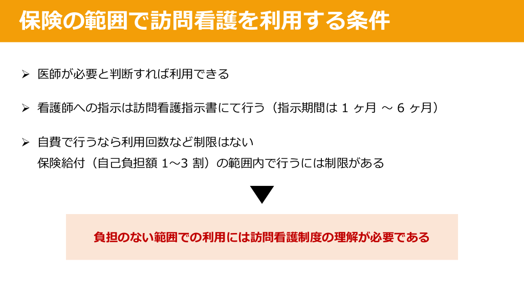 #12. 保険の範囲で訪問看護を利⽤する条件 Ø 医師が必要と判断すれば利⽤できる Ø 看護師への指⽰は訪問看護指⽰書にて⾏う(指⽰期間は 1 ヶ⽉ 〜 6 ヶ⽉) Ø ⾃費で⾏うなら利⽤回数など制限はない 保険給付(⾃⼰負担額 1〜3 割)の範囲内で⾏うには制限がある 負担のない範囲での利⽤には訪問看護制度の理解が必要である