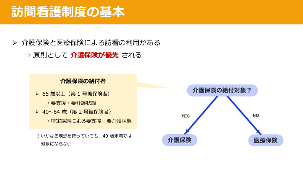 #13. 訪問看護制度の基本 Ø 介護保険と医療保険による訪看の利⽤がある → 原則として 介護保険が優先 される 介護保険の給付者 Ø 65 歳以上(第 1 号被保険者) → 要⽀援・要介護状態 Ø 40〜64 歳(第 2 号被保険者) → 特定疾病による要⽀援・要介護状態 ※いかなる疾患を持っていても、40 歳未満では 対象にならない