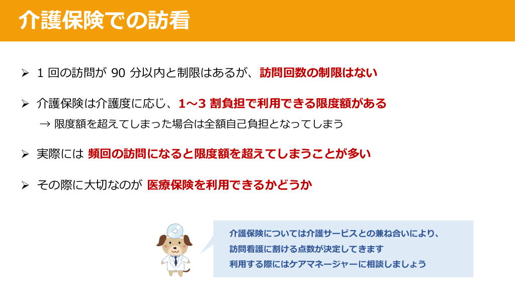 #14. 介護保険での訪看 Ø 1 回の訪問が 90 分以内と制限はあるが、訪問回数の制限はない Ø 介護保険は介護度に応じ、1〜3 割負担で利⽤できる限度額がある → 限度額を超えてしまった場合は全額⾃⼰負担となってしまう Ø 実際には 頻回の訪問になると限度額を超えてしまうことが多い Ø その際に⼤切なのが 医療保険を利⽤できるかどうか 介護保険については介護サービスとの兼ね合いにより、 訪問看護に割ける点数が決定してきます 利⽤する際にはケアマネージャーに相談しましょう