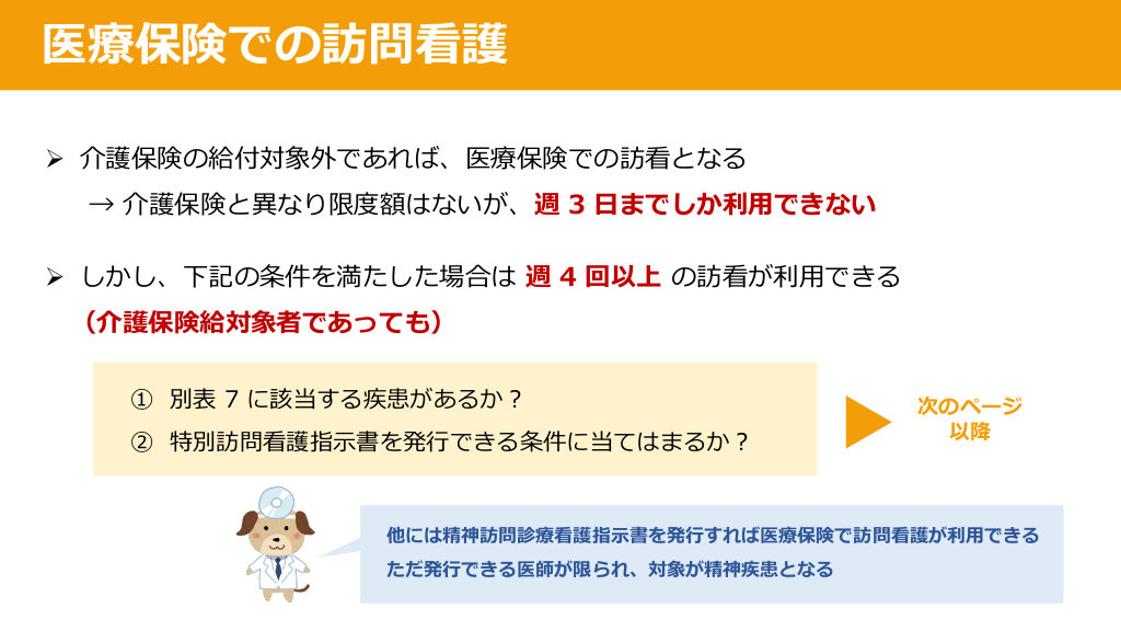 #15. 医療保険での訪問看護 Ø 介護保険の給付対象外であれば、医療保険での訪看となる → 介護保険と異なり限度額はないが、週 3 ⽇までしか利⽤できない Ø しかし、下記の条件を満たした場合は 週 4 回以上 の訪看が利⽤できる (介護保険給対象者であっても) ① 別表 7 に該当する疾患があるか︖ ② 特別訪問看護指⽰書を発⾏できる条件に当てはまるか︖ 次のページ 以降 他には精神訪問診療看護指⽰書を発⾏すれば医療保険で訪問看護が利⽤できる ただ発⾏できる医師が限られ、対象が精神疾患となる