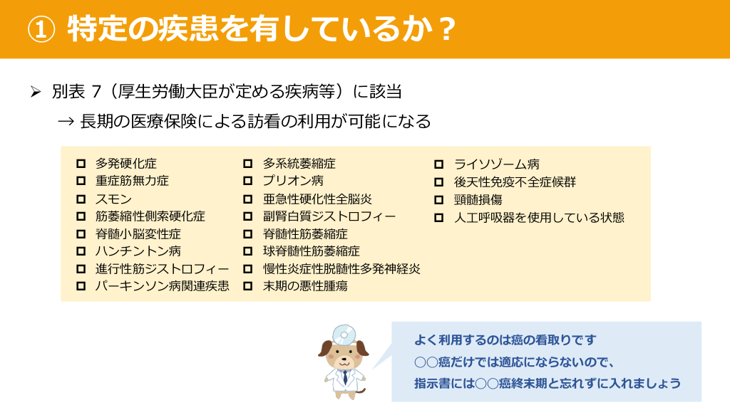 #16. ① 特定の疾患を有しているか︖ Ø 別表 7(厚⽣労働⼤⾂が定める疾病等)に該当 → ⻑期の医療保険による訪看の利⽤が可能になる p 多発硬化症 p 重症筋無⼒症 p p p p p p スモン 筋萎縮性側索硬化症 脊髄⼩脳変性症 ハンチントン病 進⾏性筋ジストロフィー パーキンソン病関連疾患 p 多系統萎縮症 p プリオン病 p p p p p p 亜急性硬化性全脳炎 副腎⽩質ジストロフィー 脊髄性筋萎縮症 球脊髄性筋萎縮症 慢性炎症性脱髄性多発神経炎 末期の悪性腫瘍 p ライソゾーム病 p 後天性免疫不全症候群 p 頸髄損傷 p ⼈⼯呼吸器を使⽤している状態 よく利⽤するのは癌の看取りです ◯◯癌だけでは適応にならないので、 指⽰書には◯◯癌終末期と忘れずに⼊れましょう