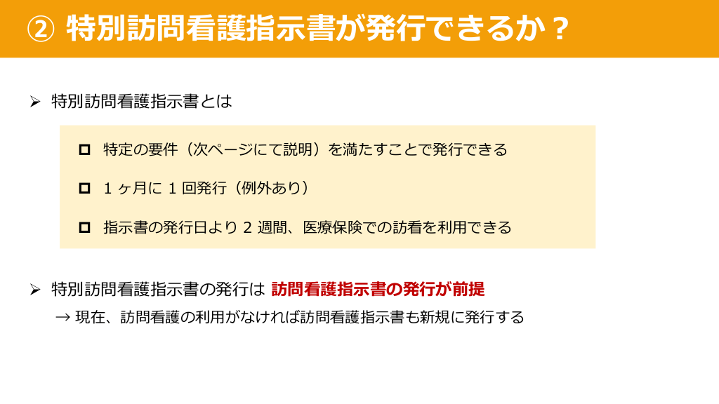 #17. ② 特別訪問看護指⽰書が発⾏できるか︖ Ø 特別訪問看護指⽰書とは p 特定の要件(次ページにて説明)を満たすことで発⾏できる p 1 ヶ⽉に 1 回発⾏(例外あり) p 指⽰書の発⾏⽇より 2 週間、医療保険での訪看を利⽤できる Ø 特別訪問看護指⽰書の発⾏は 訪問看護指⽰書の発⾏が前提 → 現在、訪問看護の利⽤がなければ訪問看護指⽰書も新規に発⾏する
