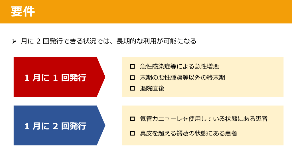 #18. 要件 Ø ⽉に 2 回発⾏できる状況では、⻑期的な利⽤が可能になる p 急性感染症等による急性増悪 1 ⽉に 1 回発⾏ 1 ⽉に 2 回発⾏ p 末期の悪性腫瘍等以外の終末期 p 退院直後 p 気管カニューレを使⽤している状態にある患者 p 真⽪を超える褥瘡の状態にある患者
