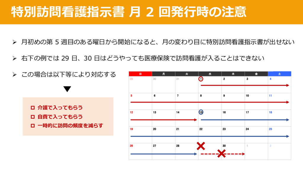 #19. 特別訪問看護指⽰書 ⽉ 2 回発⾏時の注意 Ø ⽉初めの第 5 週⽬のある曜⽇から開始になると、⽉の変わり⽬に特別訪問看護指⽰書が出せない Ø 右下の例では 29 ⽇、30 ⽇はどうやっても医療保険で訪問看護が⼊ることはできない Ø この場合は以下等により対応する p 介護で⼊ってもらう p ⾃費で⼊ってもらう p ⼀時的に訪問の頻度を減らす