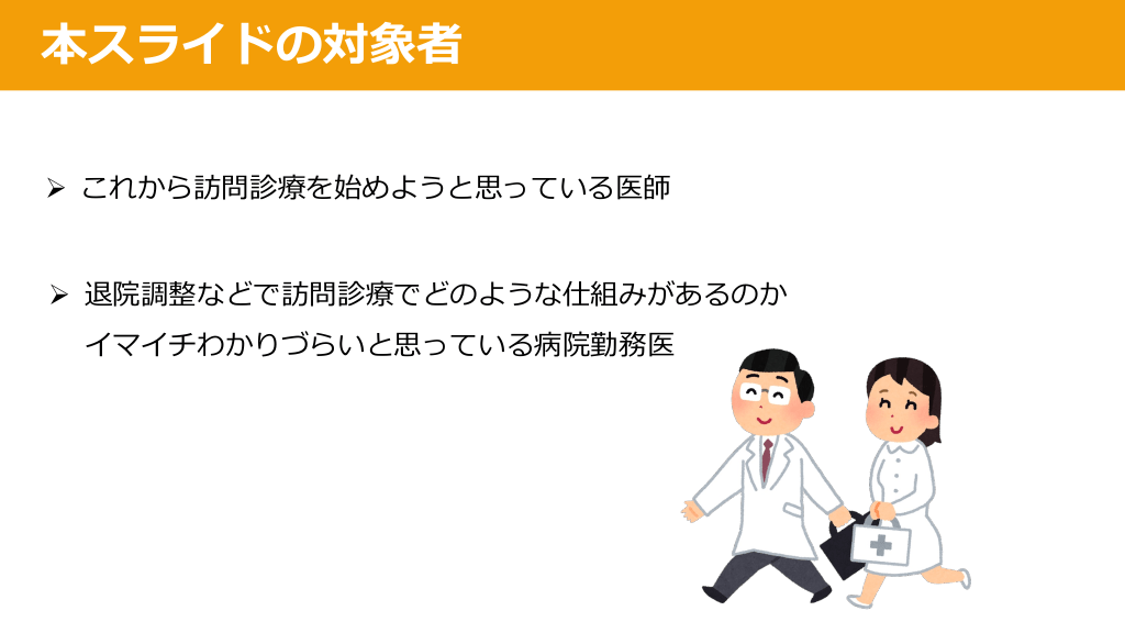 #2. 本スライドの対象者 Ø これから訪問診療を始めようと思っている医師 Ø 退院調整などで訪問診療でどのような仕組みがあるのか イマイチわかりづらいと思っている病院勤務医