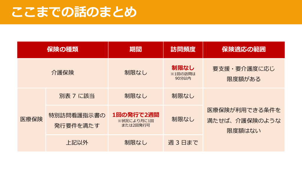 #20. ここまでの話のまとめ 保険の種類 介護保険 医療保険 期間 制限なし 別表 7 に該当 制限なし 特別訪問看護指⽰書の 1回の発⾏で2週間 発⾏要件を満たす 上記以外 ※状況により⽉に1回 または2回発⾏可 制限なし 訪問頻度 保険適応の範囲 制限なし 要⽀援・要介護度に応じ ※1回の訪問は 90分以内 限度額がある 制限なし 医療保険が利⽤できる条件を 制限なし 満たせば、介護保険のような 限度額はない 週 3 ⽇まで