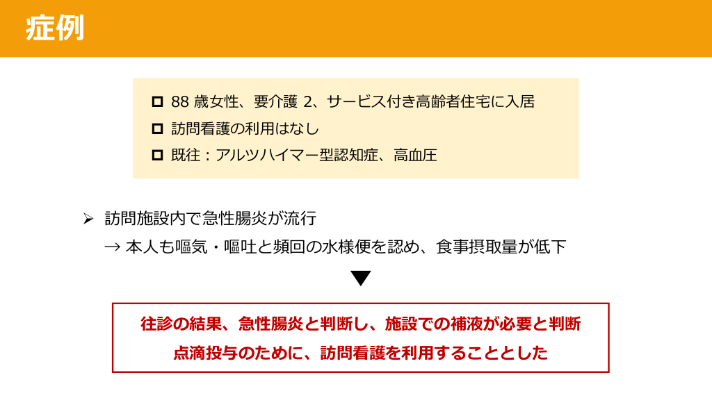 #22. 症例 p 88 歳⼥性、要介護 2、サービス付き⾼齢者住宅に⼊居 p 訪問看護の利⽤はなし p 既往︓アルツハイマー型認知症、⾼⾎圧 Ø 訪問施設内で急性腸炎が流⾏ → 本⼈も嘔気・嘔吐と頻回の⽔様便を認め、⾷事摂取量が低下 往診の結果、急性腸炎と判断し、施設での補液が必要と判断 点滴投与のために、訪問看護を利⽤することとした