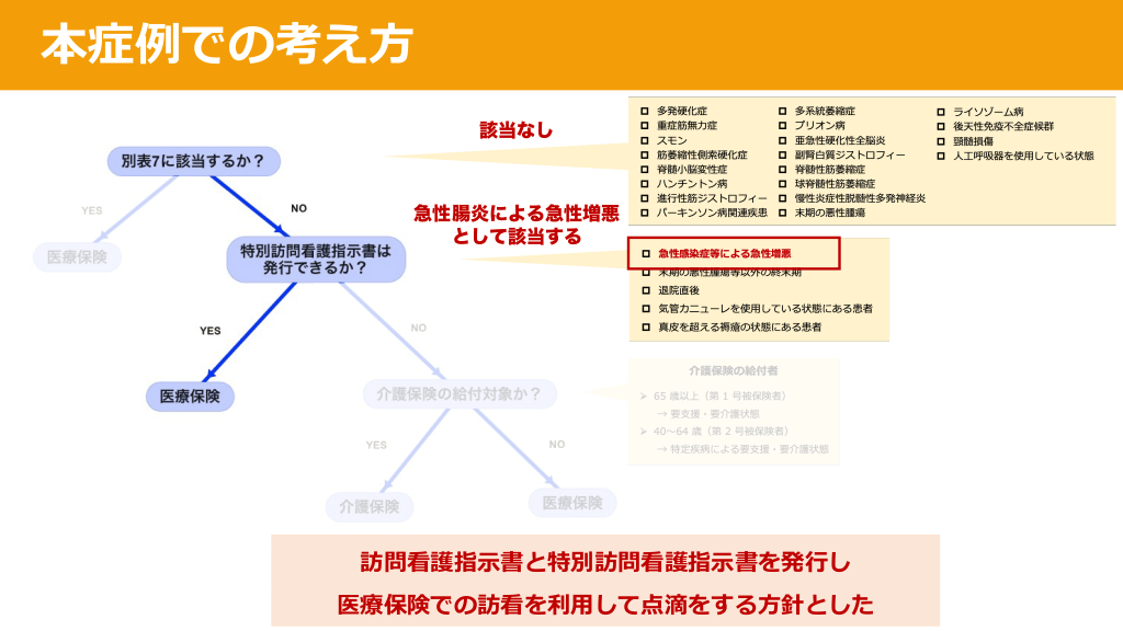 #23. 本症例での考え⽅ 該当なし 急性腸炎による急性増悪 として該当する 訪問看護指⽰書と特別訪問看護指⽰書を発⾏し 医療保険での訪看を利⽤して点滴をする⽅針とした