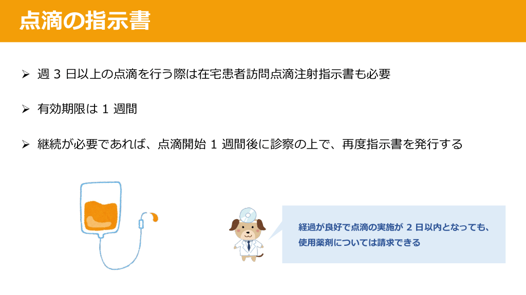 #24. 点滴の指⽰書 Ø 週 3 ⽇以上の点滴を⾏う際は在宅患者訪問点滴注射指⽰書も必要 Ø 有効期限は 1 週間 Ø 継続が必要であれば、点滴開始 1 週間後に診察の上で、再度指⽰書を発⾏する 経過が良好で点滴の実施が 2 ⽇以内となっても、 使⽤薬剤については請求できる