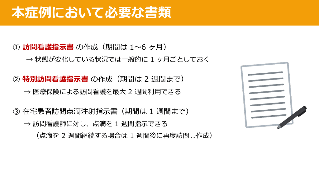#25. 本症例において必要な書類 ① 訪問看護指⽰書 の作成(期間は 1〜6 ヶ⽉) → 状態が変化している状況では⼀般的に 1 ヶ⽉ごとしておく ② 特別訪問看護指⽰書 の作成(期間は 2 週間まで) → 医療保険による訪問看護を最⼤ 2 週間利⽤できる ③ 在宅患者訪問点滴注射指⽰書(期間は 1 週間まで) → 訪問看護師に対し、点滴を 1 週間指⽰できる (点滴を 2 週間継続する場合は 1 週間後に再度訪問し作成)