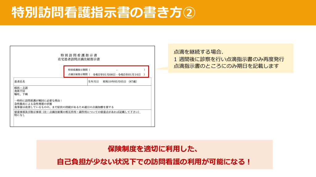 #27. 特別訪問看護指⽰書の書き⽅② 点滴を継続する場合、 1 週間後に診察を⾏い点滴指⽰書のみ再度発⾏ 点滴指⽰書のところにのみ期⽇を記載します 保険制度を適切に利⽤した、 ⾃⼰負担が少ない状況下での訪問看護の利⽤が可能になる︕