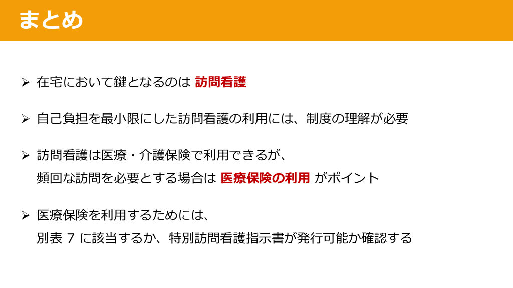 #28. まとめ Ø 在宅において鍵となるのは 訪問看護 Ø ⾃⼰負担を最⼩限にした訪問看護の利⽤には、制度の理解が必要 Ø 訪問看護は医療・介護保険で利⽤できるが、 頻回な訪問を必要とする場合は 医療保険の利⽤ がポイント Ø 医療保険を利⽤するためには、 別表 7 に該当するか、特別訪問看護指⽰書が発⾏可能か確認する