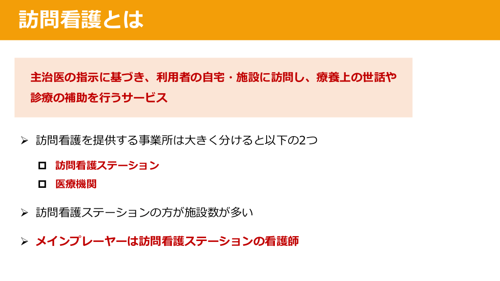 #7. 訪問看護とは 主治医の指⽰に基づき、利⽤者の⾃宅・施設に訪問し、療養上の世話や 診療の補助を⾏うサービス Ø 訪問看護を提供する事業所は⼤きく分けると以下の2つ p 訪問看護ステーション p 医療機関 Ø 訪問看護ステーションの⽅が施設数が多い Ø メインプレーヤーは訪問看護ステーションの看護師