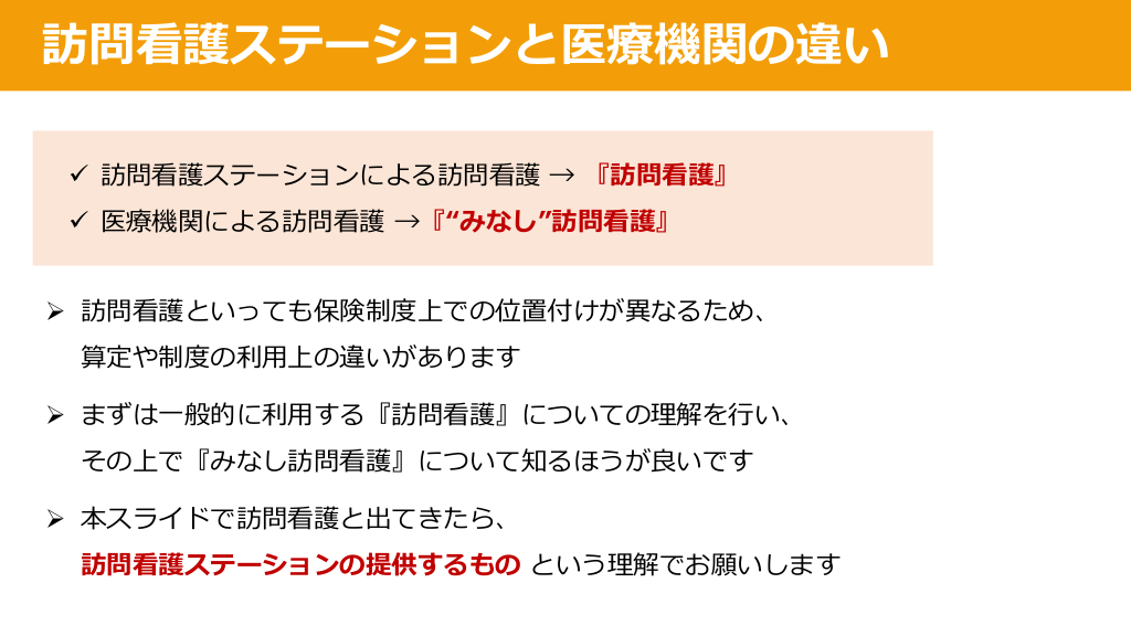 #8. 訪問看護ステーションと医療機関の違い ü 訪問看護ステーションによる訪問看護 → 『訪問看護』 ü 医療機関による訪問看護 →『“みなし”訪問看護』 Ø 訪問看護といっても保険制度上での位置付けが異なるため、 算定や制度の利⽤上の違いがあります Ø まずは⼀般的に利⽤する『訪問看護』についての理解を⾏い、 その上で『みなし訪問看護』について知るほうが良いです Ø 本スライドで訪問看護と出てきたら、 訪問看護ステーションの提供するもの という理解でお願いします