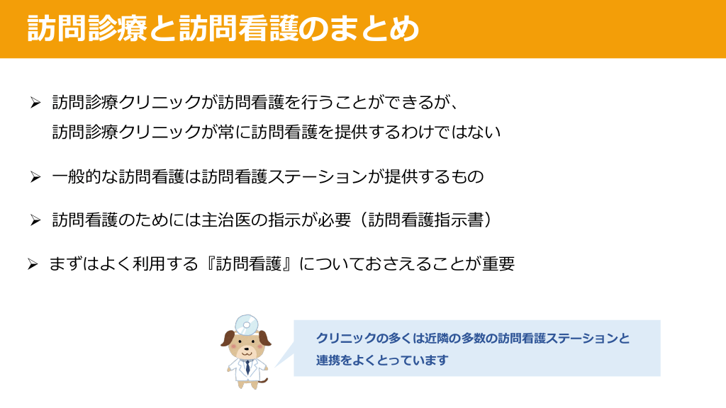 #9. 訪問診療と訪問看護のまとめ Ø 訪問診療クリニックが訪問看護を⾏うことができるが、 訪問診療クリニックが常に訪問看護を提供するわけではない Ø ⼀般的な訪問看護は訪問看護ステーションが提供するもの Ø 訪問看護のためには主治医の指⽰が必要(訪問看護指⽰書) Ø まずはよく利⽤する『訪問看護』についておさえることが重要 クリニックの多くは近隣の多数の訪問看護ステーションと 連携をよくとっています