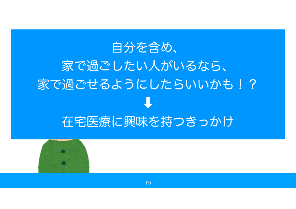 #15. 自分を含め、 「んんん!!??? 家で過ごしたい人がいるなら、 家で過ごせるようにしたらいいかも!? 俺、このままじゃ ⬇家で死ねんじゃん!」 在宅医療に興味を持つきっかけ 15