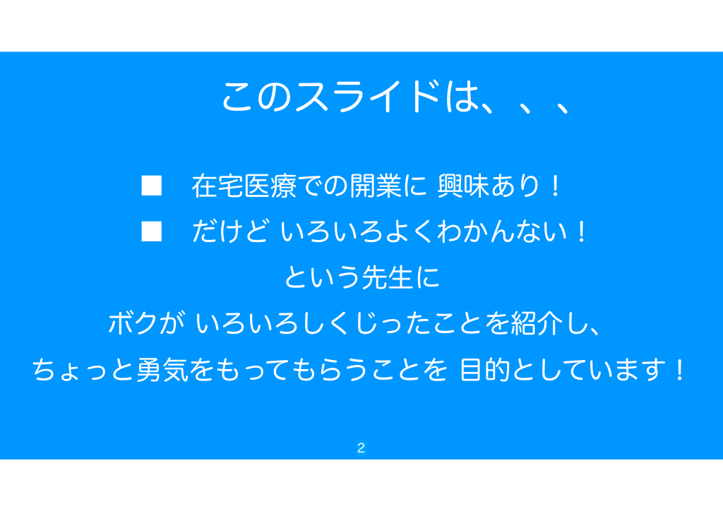 #2. このスライドは、、、 ■ 在宅医療での開業に 興味あり! ■ だけど いろいろよくわかんない! という先生に ボクが いろいろしくじったことを紹介し、 ちょっと勇気をもってもらうことを 目的としています! 2