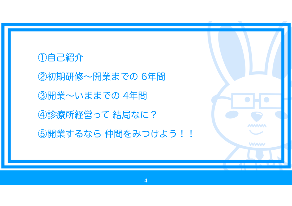 #4. ①自己紹介 ②初期研修〜開業までの 6年間 ③開業〜いままでの 4年間 ④診療所経営って 結局なに? ⑤開業するなら 仲間をみつけよう!! 4